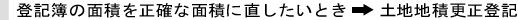 登記記録(登記簿)の面積を正確な面積に直したい時は、土地地積更正登記を行います。土地の登記記録には、土地の所在・地目・地積等が登記されています。地積更正登記とは、土地境界確定測量を行ったときに、登記記録の地積と現在の土地の地積が相違する場合に登記記録の地積を現在の正しい地積に直す登記のことをいいます。地積更正登記の前提として土地境界確定測量が必要になります。 |